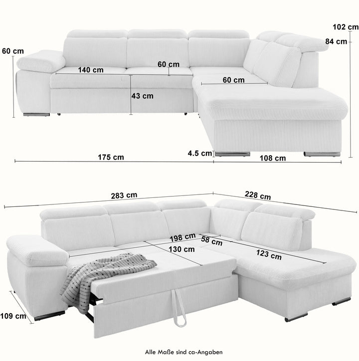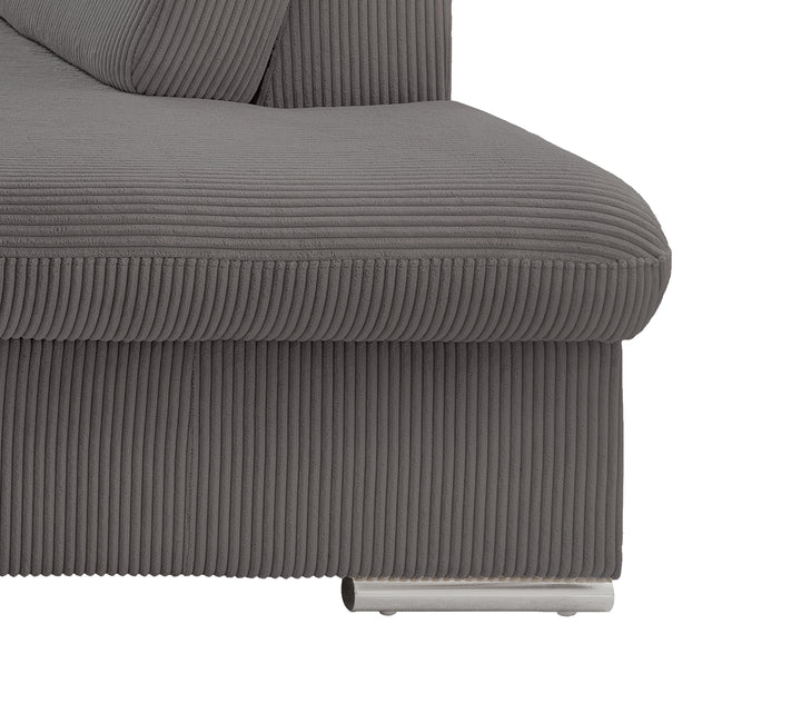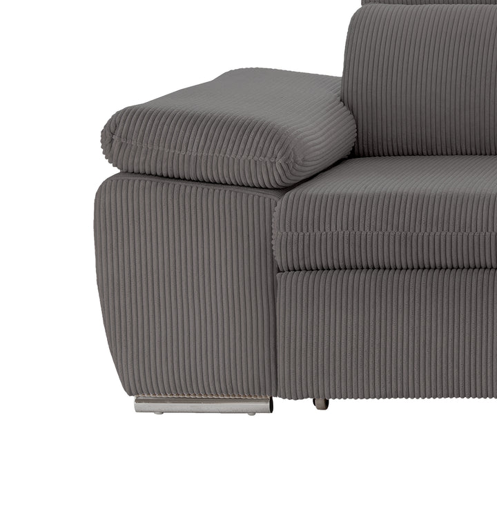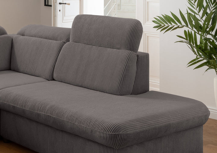 Das wunderschöne Ecksofa mit dem ansprechenden Cord-Bezug liegt voll im Trend der Zeit und ist der absolute Hingucker! Es begeistert durch seine zeitlose Farbgebung. Eine hochwertige Wellenunterfederung mit Komfortschaum sorgt für einen angenehmen Sitz- und Liegekomfort. Die verstellbaren Kopfstützen machen den Sitzkomfort perfekt. Mit einfachen Handgriffen wird aus dem Ecksofa eine Liegefläche, die zum Träumen und Schlafen einlädt. Der praktische Bettkasten schafft genug Stauraum für Kissen und Decken.Allgemeines:
