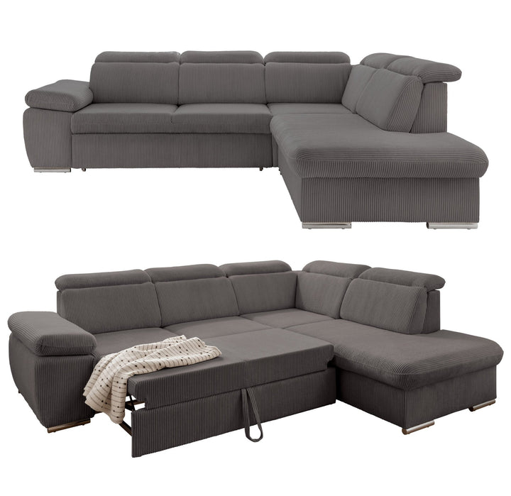 ECKSOFA mit Schlaffunktion, Bettkasten, Kopfstützen verstellbar, Wellenunterfederung, Ottomane rechts B283/T228/H102 cm, Cord Grau Anthrazit / 17217